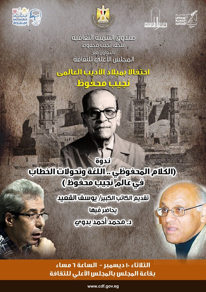 بمناسبة الاحتفال بذكري ميلاد نجيب محفوظ، ينظم متحف الأديب العالمي نجيب محفوظ - التابع لقطاع صندوق التنمية الثقافية على مدار 3 ايام عدد من الانشطه للاحتفاء بأديب نوبل ، حيث يقام في السادسة مساء الثلاثاء 10 ديسمبر، بمقر المجلس الأعلي للثقافة، ندوة بعنوان " الكلام المحفوظي .. اللغة وتحولات الخطاب في عالم نجيب محفوظ"، حيث يستضيف الكاتب الكبير يوسف القعيد رئيس مجلس امناء المتحف مدير الندوة الدكتور محمد بدوي أستاذ الأدب العربي بجامعة القاهرة الذى يستعرض التحولات الاساسية في اللغة العربية الحديثة بين الفصحى والعامية منذ بداية القرن العشرين وحتى الان بشكل عام، مع التركيز على دور "محفوظ" فى هذه التحولات وما انجزه فى هذا المجال عبر مسيرته الروائية ، مشيرا الى طرق إعداد الكتاب المصريين الأوائل ،ولغة كراسات الانشاء " التي سادت بين كتاب هذا العصر فى ذلك العصر وكيف تمكن محفوظ من تجاوزها، كما يتحدث بدوي عن حرب اللغة بين الكتاب التقليديين والكتاب المحدثين الذين مثلهم محفوظ بعد توفيق الحكيم ويحيي حقي، والكيفية التى حسم بها محفوظ معركته مع اللغة القديمة، وتختتم الندوة بتقديم تحليلات عامة لبعض نصوصه الروائية .